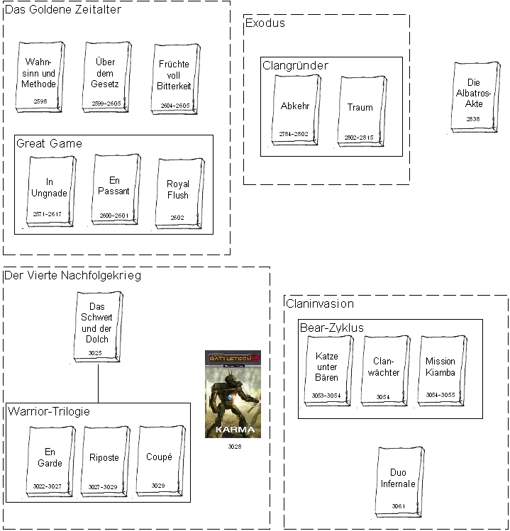 Bei BattleTech gibt es unterschiedliche Zeitlinien, die das mehr als 500 Jahre umspannende Handlungsuniversum einteilen. Im »Goldenen Zeitalter« erreicht die Technologie Höhen, die zuvor und auch danach ihres Gleichen suchen. Es ist die Zeit, in der die Camerons die Menschheit einen, den Vereinigungskrieg bis in die Tiefen der Peripherie tragen. Darauf folgt der »Exodus«, in dem die Sternenbundarmee beschließt, dem besiedelten Weltraum den Rücken zu kehren. Ohne die starke Zentralmacht zerfällt die Innere Sphäre, das Erbe wird von den Nachfolgestaaten zerrissen. Jeder von ihnen will die Menschheit einen – unter seiner Herrschaft. Daraus entstehen die Nachfolgekriege, deren bekanntester der »Vierte Nachfolgekrieg« ist. Wie nicht anders zu erwarten, produziert er zwar einige Nachbeben, aber kein rechtes Ergebnis. So dümpelt die Menschheit vor sich hin, bis irgendwann eine geheimnisvolle Bedrohung aus den Tiefen des unbesiedelten (?) Weltraums auftaucht. Eine Macht, die mit überlegenen Waffen die »Claninvasion« betreibt.